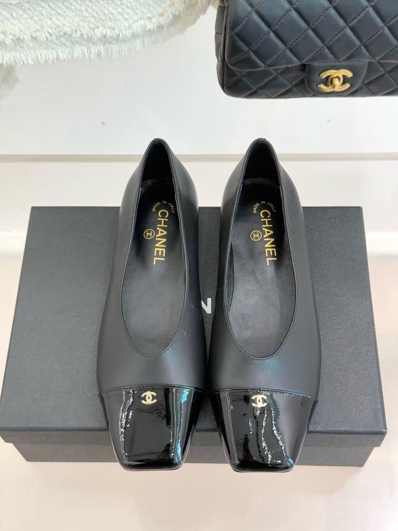 CHANE1 高品質スクエアトゥ ダブルC ラムスキン フラットシューズ【50%割引+送料無料】