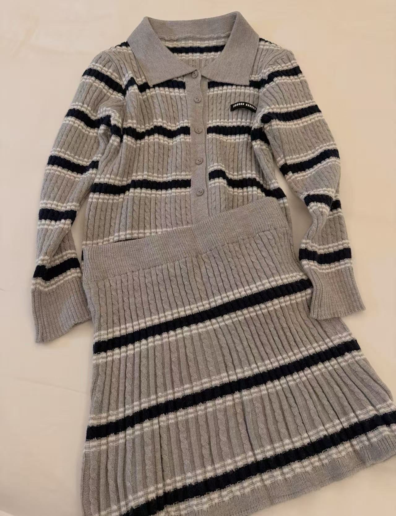M1UM1U ストライプラペルウールカーディガン+スカート2点セット【50%割引+送料無料】